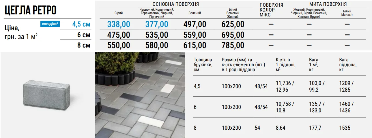 Універсальна форма тротуарної плитки “Цегла ретро” придатна для створення безлічі оригінальних візерунків. На перший погляд, звичний та простий прямокутник часто стає відправною точкою польоту фантазії дизайнера. Кілька яскравих акцентів або контрастних поєднань, сміливі композиційні рішення надають Цеглі ретро сучасного звучання.