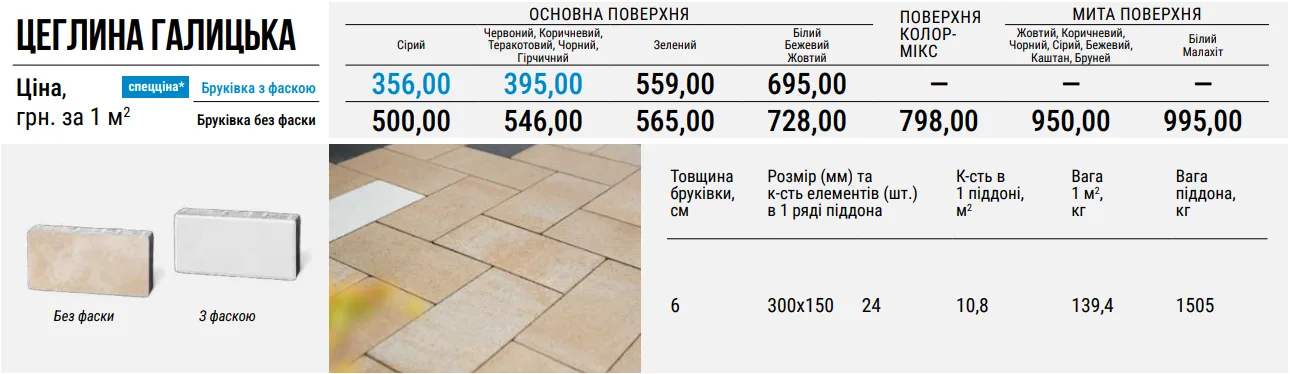 Бруківка «Цеглина Галицька» без фаски, на відміну від Цеглини Галицької з фаскою, доступна також у митій поверхні та поверхні колор-мікс. Це надасть вам додаткові можливості при створенні дизайну.