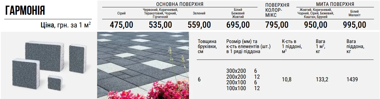 Поверхні, замощені Гармонією, приваблюють акуратністю та симетрією геометричних форм і ніколи не виглядаюсь монотонними. Дана бруківка надасть сучасного вигляду міським площам та тротуарам, просторим дворам, під’їзним шляхам, терасам кафе.