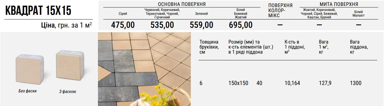 Бруківка “Квадрат 15х15” має менші розміри, ніж Квадрат львівський, проте володіє всіма його якостями та перевагами. При виборі бруківки слід враховувати, що чим більшою є територія, тим більшими можуть бути елементи мощення. Завдяки компактному формату “Квадрат 15х15” придатний для облаштування невеликих площ, наприклад, дворів і проїздів у місцях приватної забудови, маленьких вуличок і тротуарів.