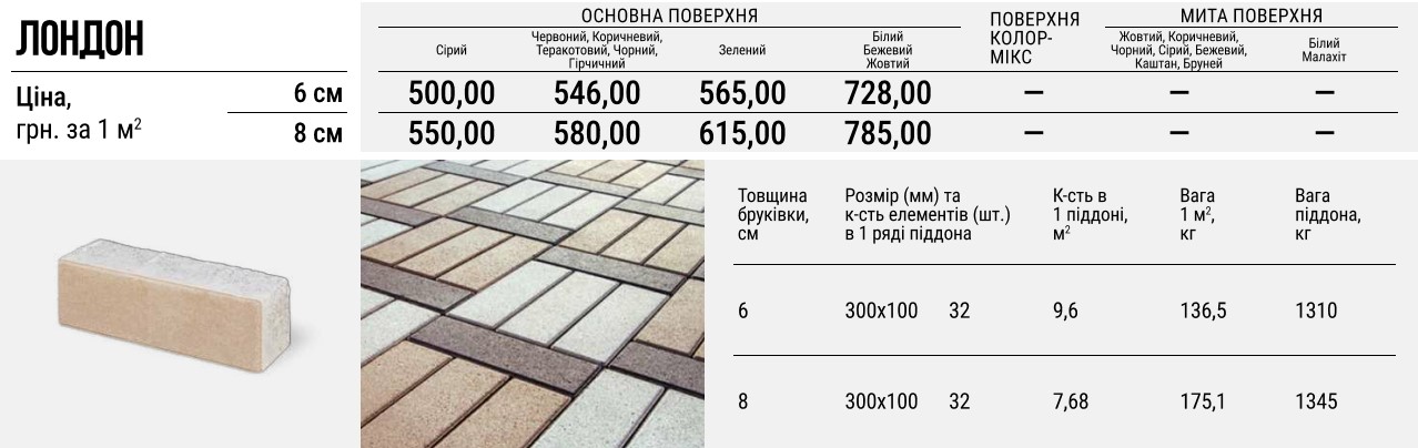 Також Лондон поєднується з будь-якими квадратними чи прямокутними видами бруківки (наприклад, Квадрат 15х15, Цегла Ретро тощо). Можливості для комбінацій та нестандартних рішень необмежені.