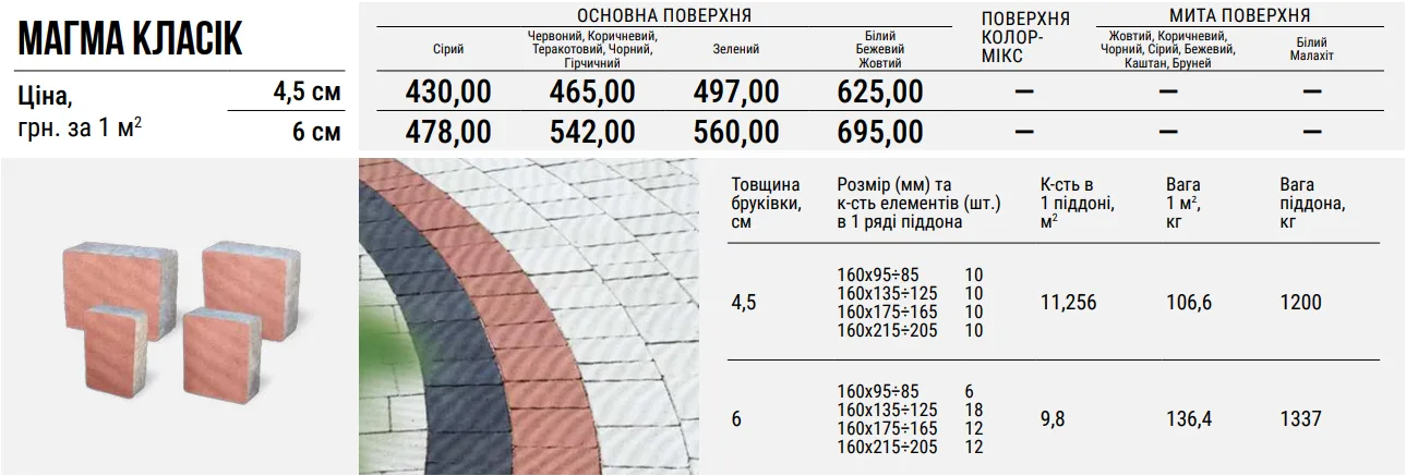 Зручна та проста в укладанні, Магма класік водночас не створює жодних обмежень в замощенні. Прямі чи плавні хвилясті лінії — вибір залежить лише від Вашого бажання та фантазії. Рельєфна поверхня бруківки не є ковзкою та ідеально підходить для руху транспортних засобів.