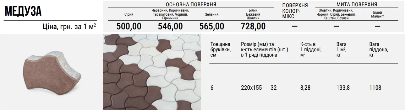 Медуза має доволі незвичну форму, саме така оригінальна конфігурація дозволяє урізноманітнити поверхню замощення, надати їй плавності природних ліній. Візерунки створюються шляхом акцентування кольором окремих плиток. При цьому процес укладання є доволі простим.