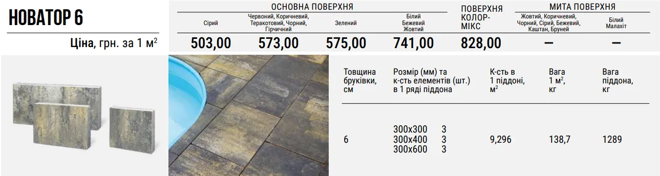 Бруківка Новатор 6 по конфігурації схожа на традиційний Новатор 8, проте відрізняється меншою довжиною елементів, товщиною виробу та відсутністю фаски.