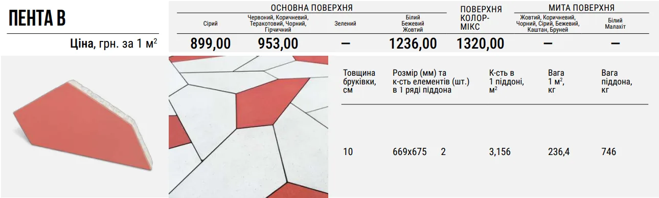 Зверніть увагу, що «Пента В» може укладатися лише у комплекті з бруківкою «Пента А», разом вони створюють довершене поєднання. Також при замощенні цих видів бруківки можна обійтися без використання поребриків. «Пента В» найбільш тонко підкреслить лаконічну красу сучасної архітектури, стане справжньою знахідкою для великих відпочинкових комплексів, міських парків, просторих садів, літніх терас.