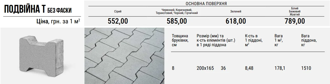 Подвійна Т — це бруківка промислового застосування, де визначальними є експлуатаційні характеристики виробу. Її специфічна форма забезпечує ідеальне зчеплення бетонних елементів і, як наслідок, надійну, стійку та довговічну поверхню.