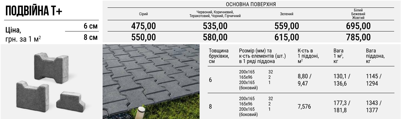 Подвійна Т — це бруківка промислового застосування, де визначальними є експлуатаційні характеристики виробу. Її специфічна форма забезпечує ідеальне зчеплення бетонних елементів і, як наслідок, надійну, стійку та довговічну поверхню.
