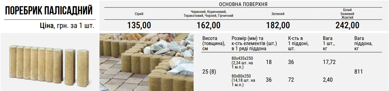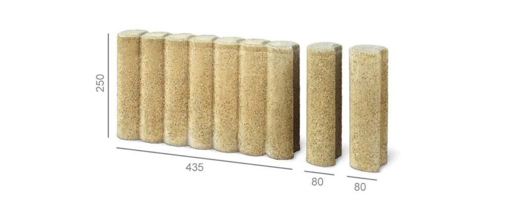 Поребрик палісадний — це сім з’єднаних між собою циліндричних палісадів в комплекті з двома поворотними елементами.