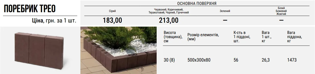 Трео – це виріб, який поєднує в собі найкращі властивості поребрика та палісада. Для зручності укладання він являє собою єдиний елемент довжиною 50 см, проте завдяки візуальному поділу кожного поребрика на три частини, після встановлення Трео виглядатиме як сучасний прямокутний палісад.