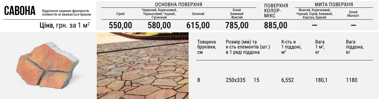 Лінія тротуарної плитки “Савона” містить 15 базових елементів одного розміру, проте з різним розташуванням внутрішніх швів, що імітує колотий камінь та надає фрагментам неповторності.