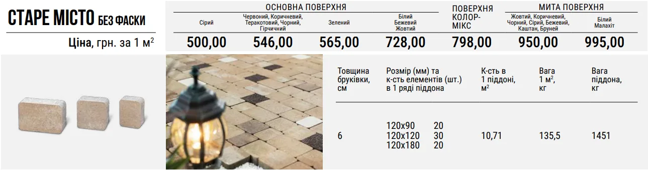 Бруківка «Старе місто» без фаски доступна також у митій поверхні та поверхні колор-мікс, що відкриває додаткові можливості створення дизайну.