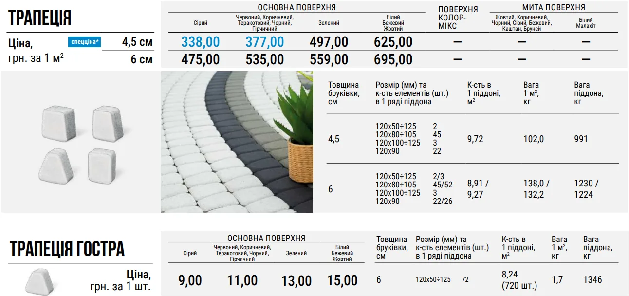 Часто “Трапецію” компонують з бруківкою “Старе місто”, використовуючи перший вид тротуарної плитки як прикрасу «полотна» бруківки. За допомогою Трапеції ви без зусиль додасте окраси прибудинковій території чи міській площі, підкреслите витонченість алей у парку чи сквері.